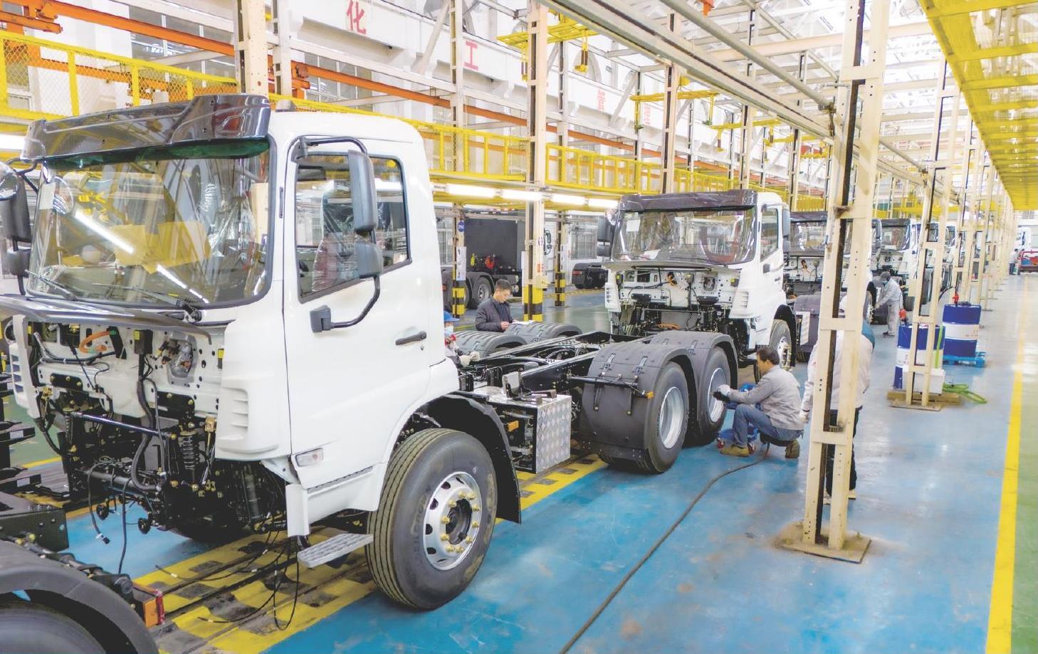 3月7日,在位于十堰经济技术开发区的湖北世纪中远车辆有限公司总装车间,工人们加紧赶制新能源重卡订单。该公司一季度计划完成500辆新能源汽车订单,预计实现工业产值2.5亿元,同比增长512%。特约记者刘爱理摄