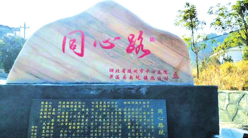在当地政府的大力支持下,一条长2公里、宽7米的“同心路”现已正式通车,给村民的生产生活带来了极大便利,也为该村获评为全国文明村奠定了良好基础。为了感谢随州市中心医院全院干部职工捐资助建善举,兆佳村专门在村头路口处刻“同心路赋”于纪念石。
