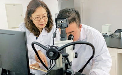 马晓燕(左)指导学生分析年轮宽度。