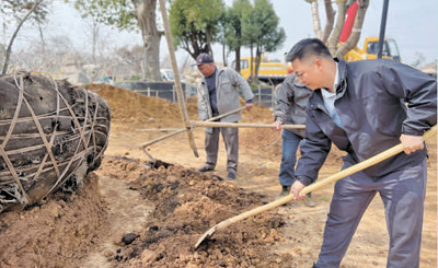基地内同样热闹,挖掘机吊起枫树树苗,稳稳地放入提前挖好的树坑中。程伟达带领苗木工人,扶苗、培土、踩实、浇水……