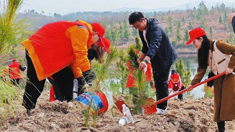 3月12日,共青团随州市委、市委直属机关工委、市自然资源和规划局、随州市青年联合会组织全市团员青年到曾都区万店镇横山村开展“美丽随州·青春行动”义务植树活动,400多名“志愿红”在先觉庙水库岸边栽植湿地松4000棵,以实际行动助力生态文明建设,为打造城乡融合发展示范区贡献青春力量。(随州日报全媒记者徐斌摄)