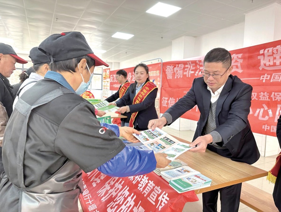 银行工作人员为企业员工发放宣传手册。