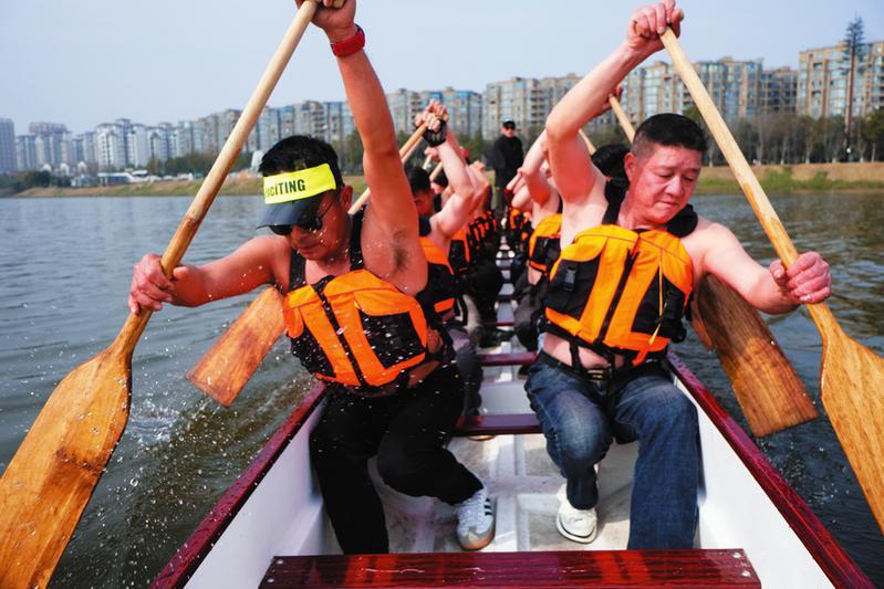 我市水上运动协会在市文旅局的支持下成立首支龙舟队,由22名水上运动爱好者组成,他们将在白云湖开展常态化训练。图为他们训练的情景。 (随州日报全媒记者李文军摄)