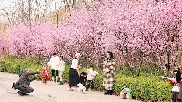 3月16日,记者在城区仁威路看到,娇艳的梅花竞相开放,把道路装扮得分外美丽。行走期间,仿佛走进了童话世界。据了解,仁威路沿线种植有美人梅、紫薇、桂花、紫叶李等10多种景观树木,总计7000多株。近期天气回暖,1500多株美人梅绽放,吸引众多市民前往打卡拍照。记者叶楚榕摄