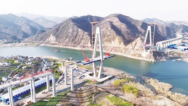 3月14日,记者在郧阳区五峰乡西峰村拍摄的十巫北高速公路汉江特大桥建设现场。该大桥北岸为郧西县观音镇垭子湾村,南岸为郧阳区五峰乡西峰村,目前施工单位正抢抓春季黄金期加快工程建设。十巫北高速公路起于郧西县城关镇天河坪村,连接福银高速公路,经观音镇,跨汉江,过郧阳区五峰乡,止于鲍峡镇,与十巫高速公路鲍峡至溢水段对接,预计2025年11月竣工通车。特约记者王涛摄