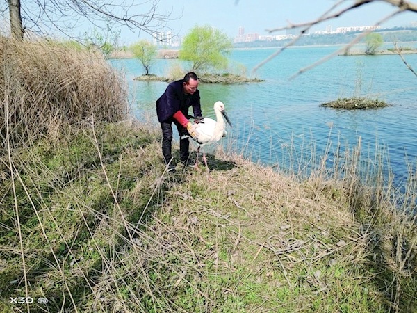 野保工作人员在蒿口村汉江流域发现这只东方白鹳。