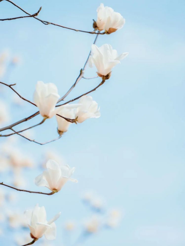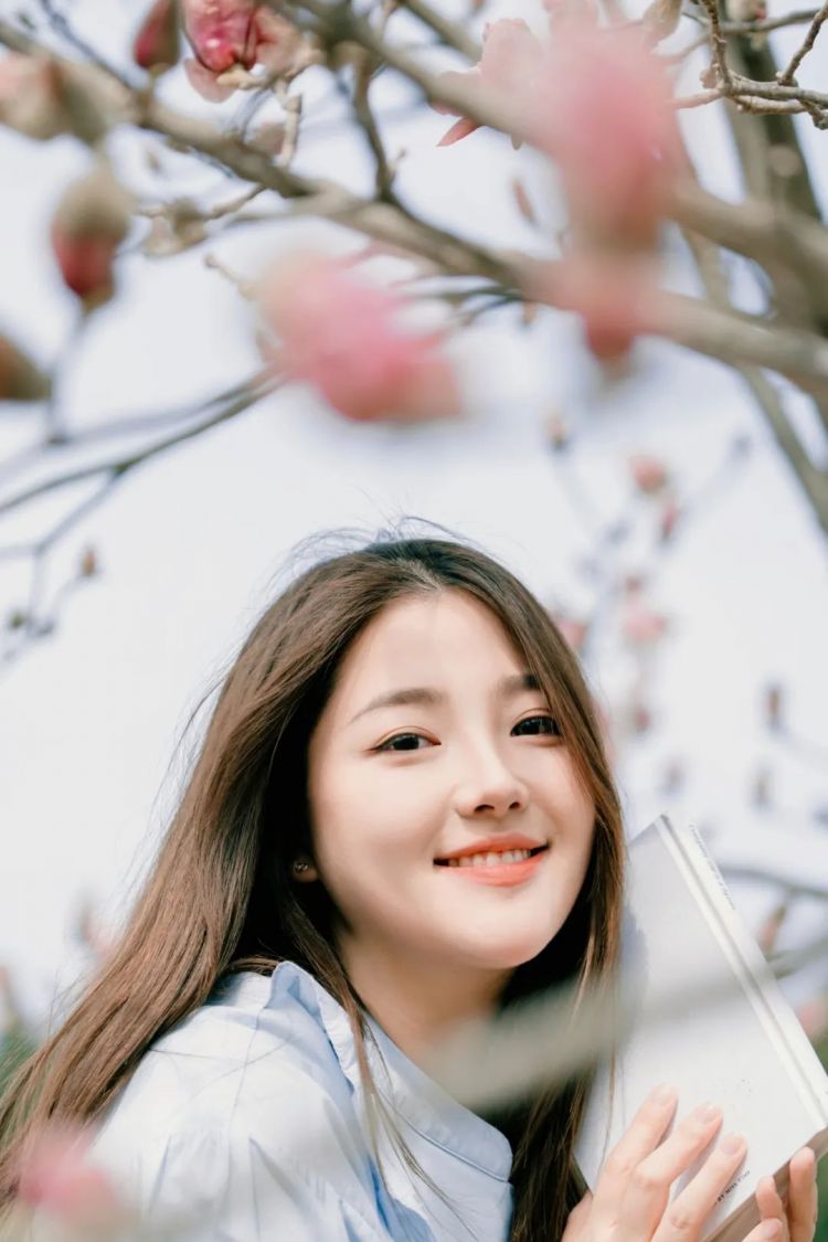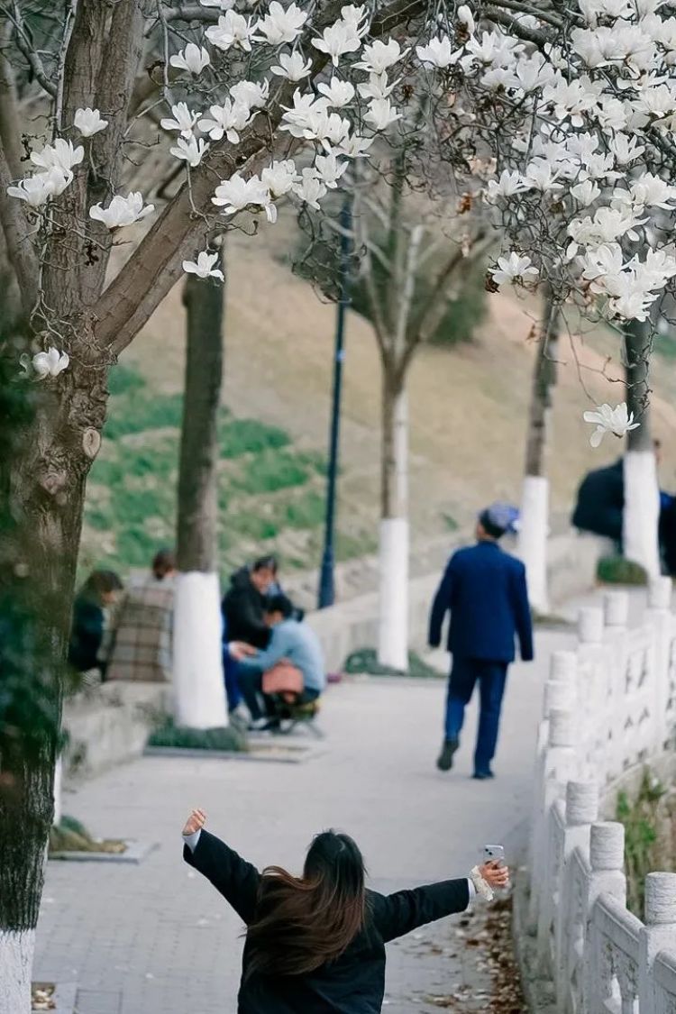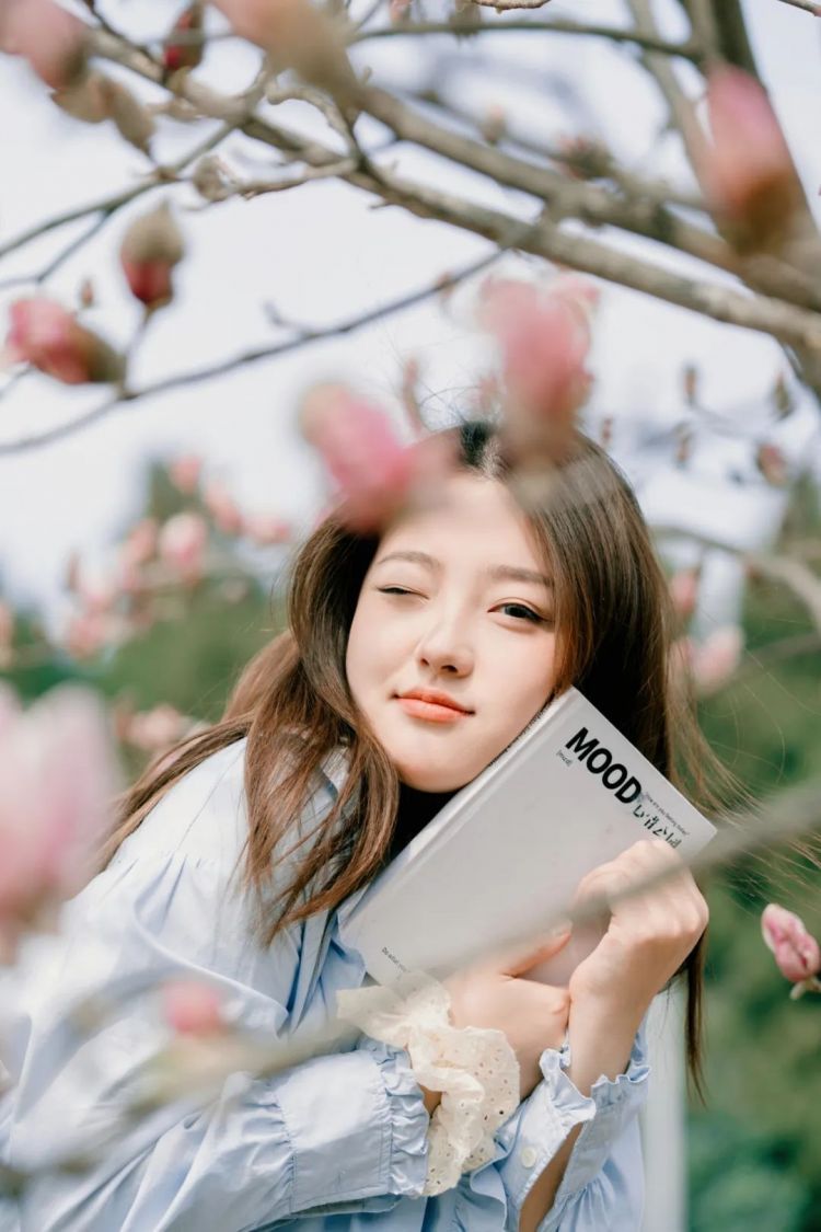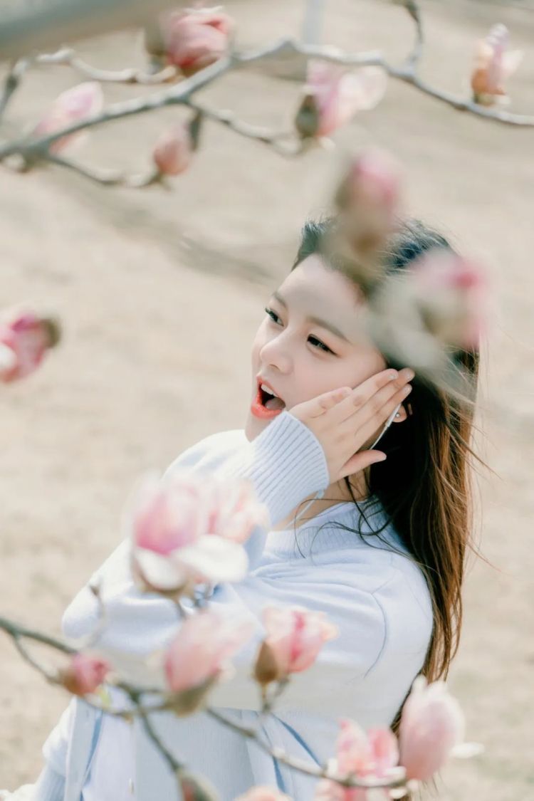 在拍摄玉兰花时,我们主要是利用垂下来的枝条作为互动和前景。如果有条件的话可以站到高处透过花树从上往下拍,甚至可以带上梯子或者凳子,站到花的中间去。除了拍摄人物特写之外,可以和树一起拍一些大场景。一般会有稍稍仰拍的方式让人和花更融合哦。
