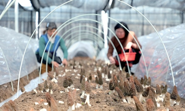 3月20日,郧阳区谭家湾镇心怡家庭农场农户在采收羊肚菌。谭家湾镇立足本地特色,把珍稀菌产业作为调整农业结构、发展乡村经济、增加农民收入的重要载体,引进湖北坤田农业科技有限公司,推动珍稀菌产业发展,带动群众就业增收。记者潘世新摄