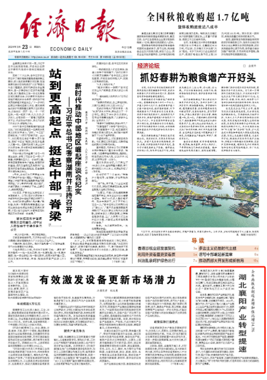 3月23日,经济日报头版关注湖北襄阳产业发展,发布文章《去年高技术制造业增加值比增24.7%湖北襄阳产业转型提速》,全文如下: