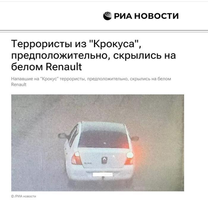 据俄新社当地时间23日报道,根据该媒体掌握的照片,俄罗斯首都莫斯科近郊音乐厅恐袭事件的嫌疑人乘坐一辆白色汽车逃离。