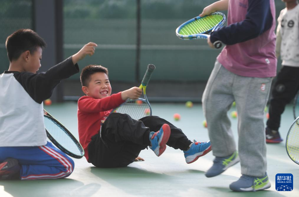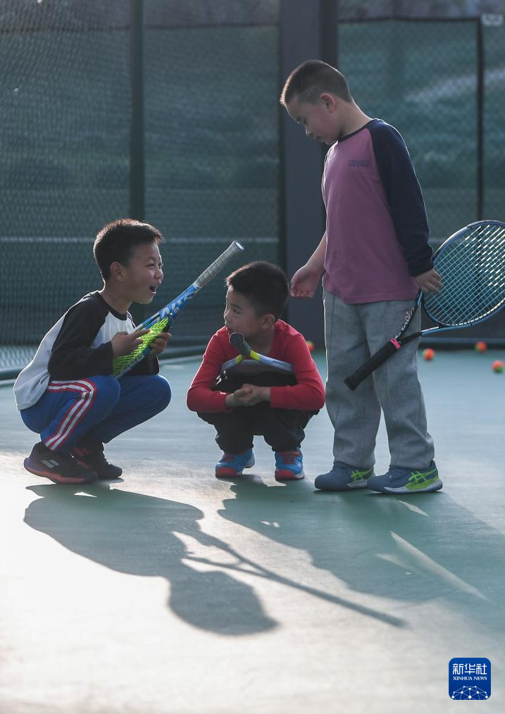 3月21日,在湖北省京山市文峰公园网球场,湖北省网球学校学生潘俊辰(中)在训练间隙与同学玩耍。新华社记者 杜子璇 摄