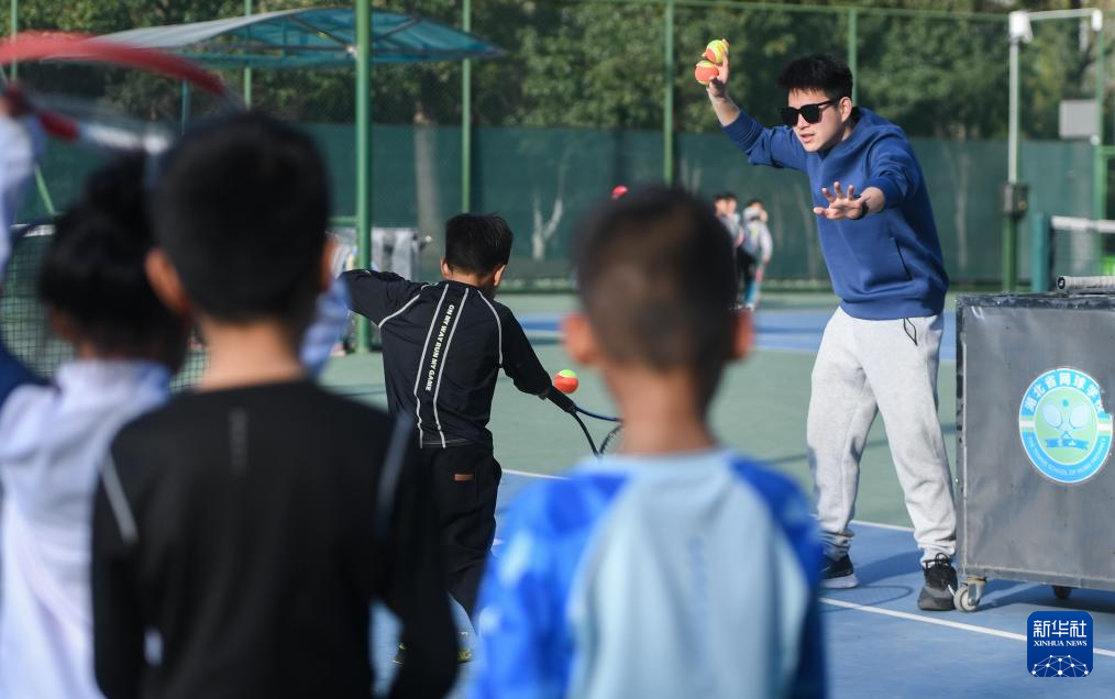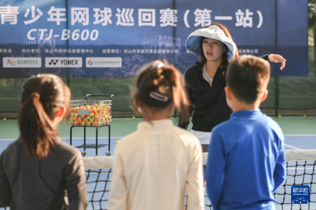 3月21日,在湖北省京山市文峰公园网球场,教练指导学生们训练。新华社记者 杜子璇 摄