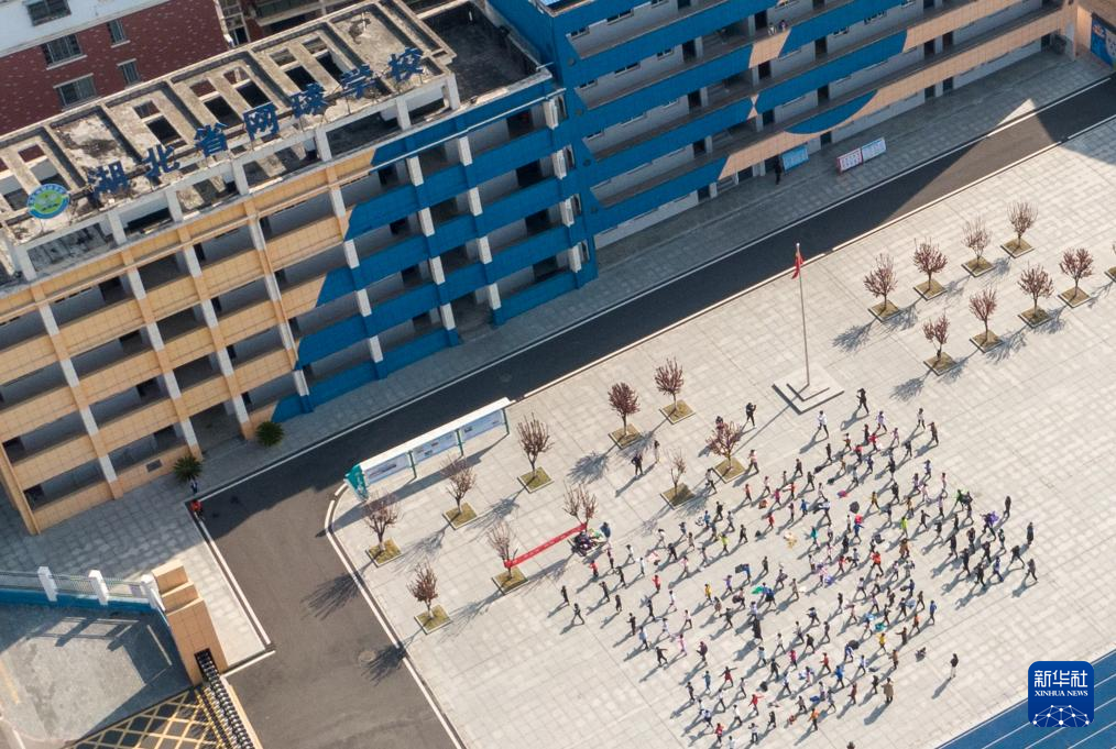3月22日,在湖北省网球学校,学生们在课间做广播体操(无人机照片)。新华社记者 杜子璇 摄