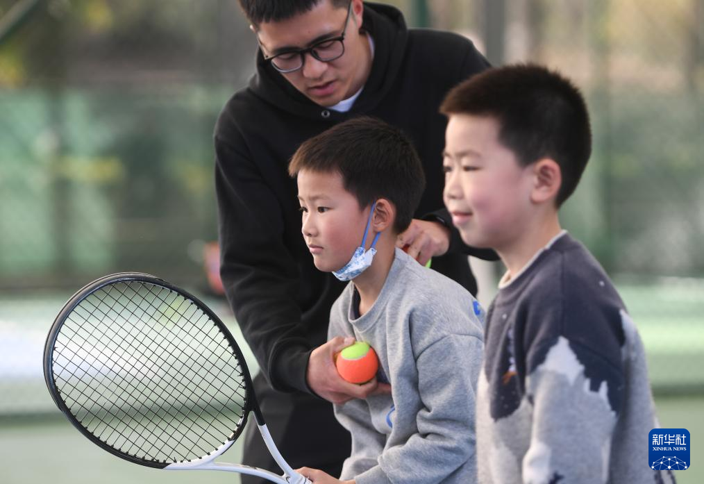 3月21日,在湖北省京山市文峰公园网球场,教练杨宽(后)指导学生训练。新华社记者 杜子璇 摄