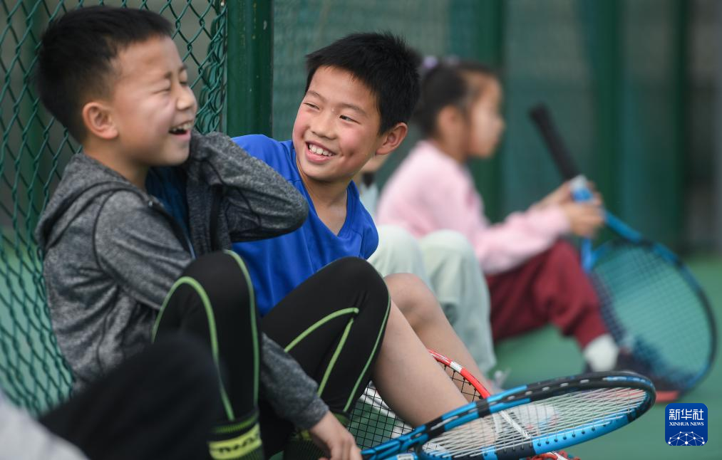 3月21日,在湖北省京山市文峰公园网球场,学生们在训练间隙玩耍。新华社记者 杜子璇 摄