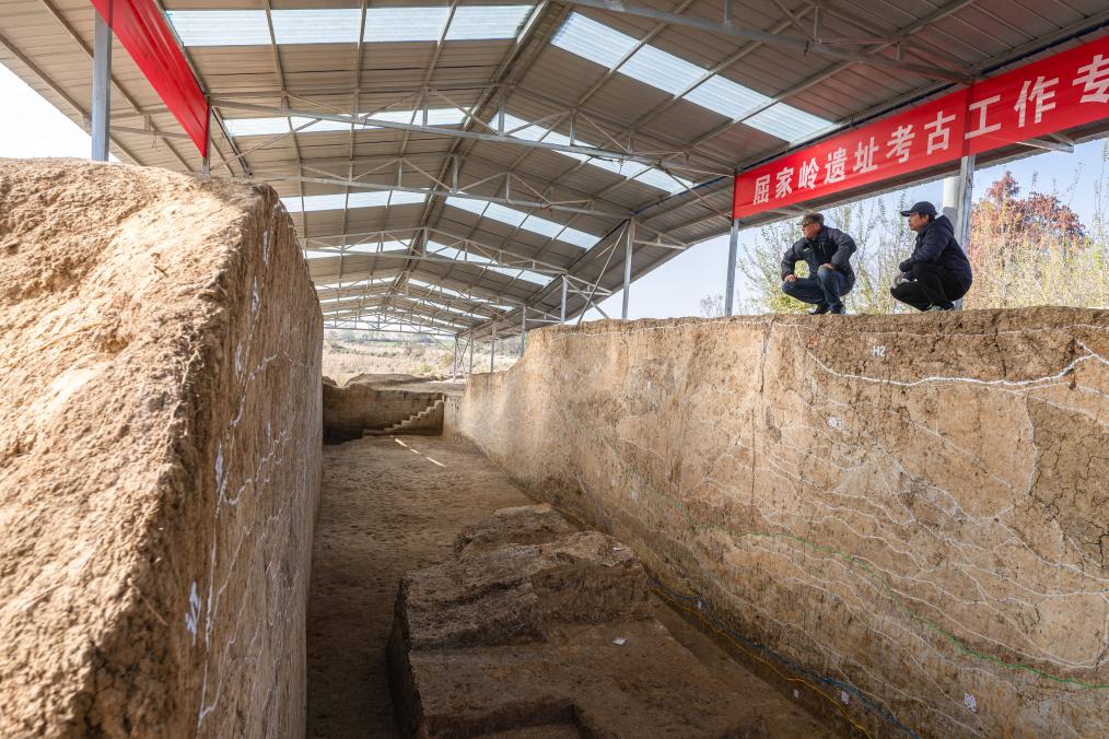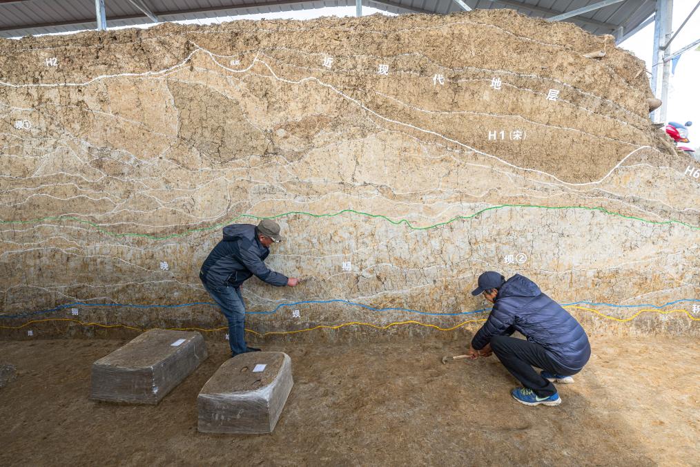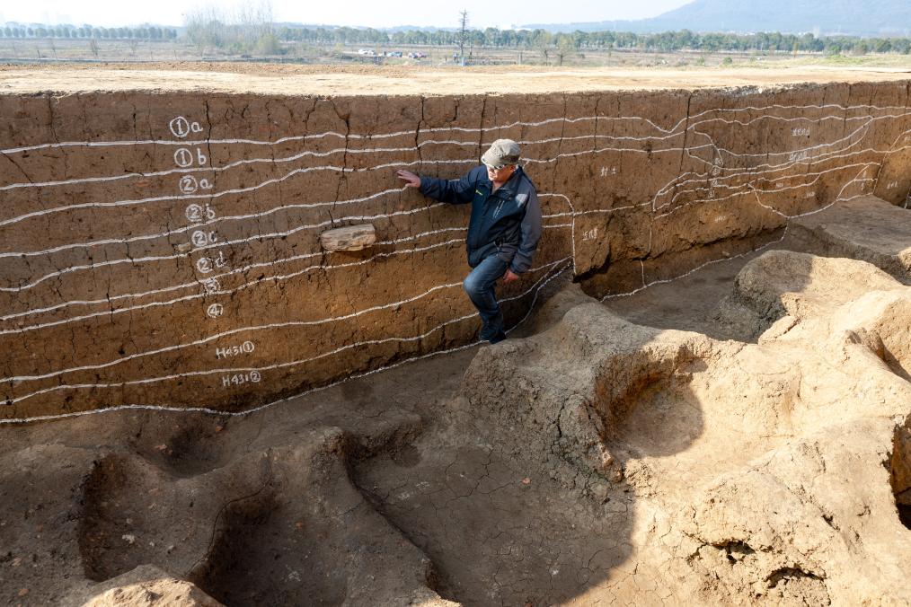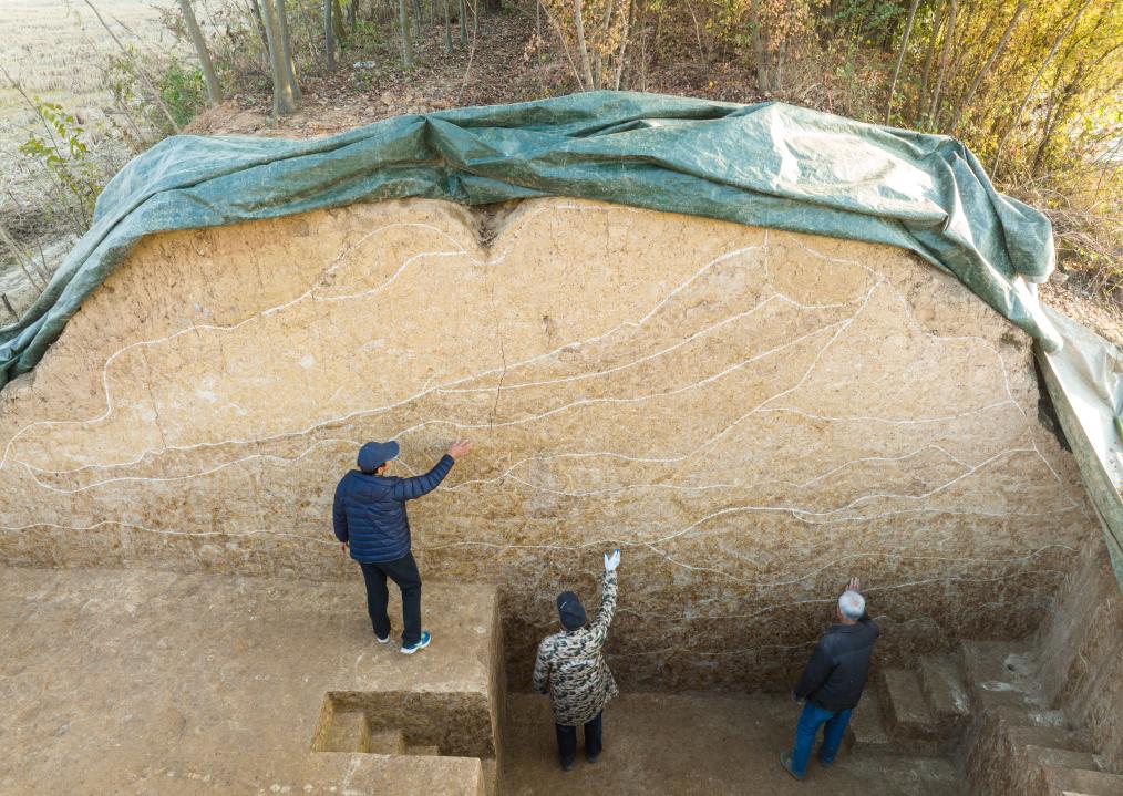 2023年12月4日,考古人员在湖北荆门屈家岭遗址熊家岭水坝现场进行考古工作。