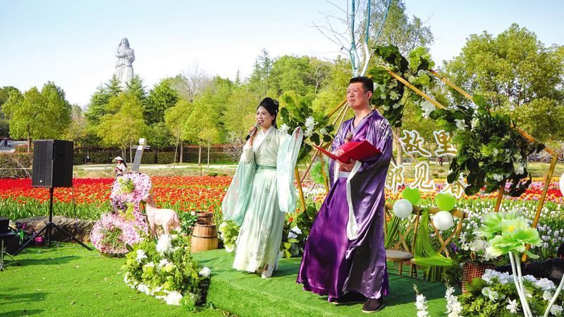3月22日,在炎帝故里景区烈山湖畔开满郁金香的花圃里,举行了一场别开生面的“相约故里遇见春天”春季朗诵会。我市多位知名朗诵艺术家与朗诵爱好者齐聚一堂,用《春天的诗行》《人间四月天》《春天在一首诗里醒来》等诗歌,共同演绎春天的故事。 (随州日报全媒记者李文军摄)