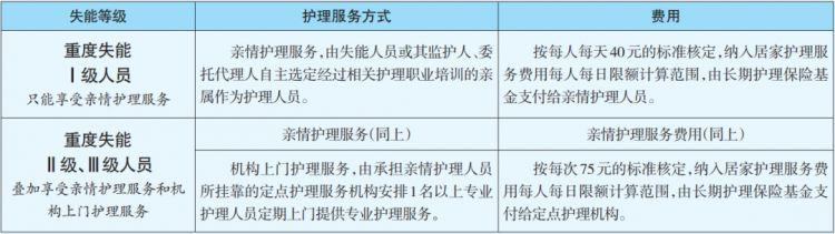 选择居家护理的失能人员,根据失能等级享受相应护理服务。其中,重度失能Ⅰ级人员只能享受亲情护理服务,重度失能Ⅱ级、Ⅲ级人员可叠加享受亲情护理服务和机构上门护理服务。