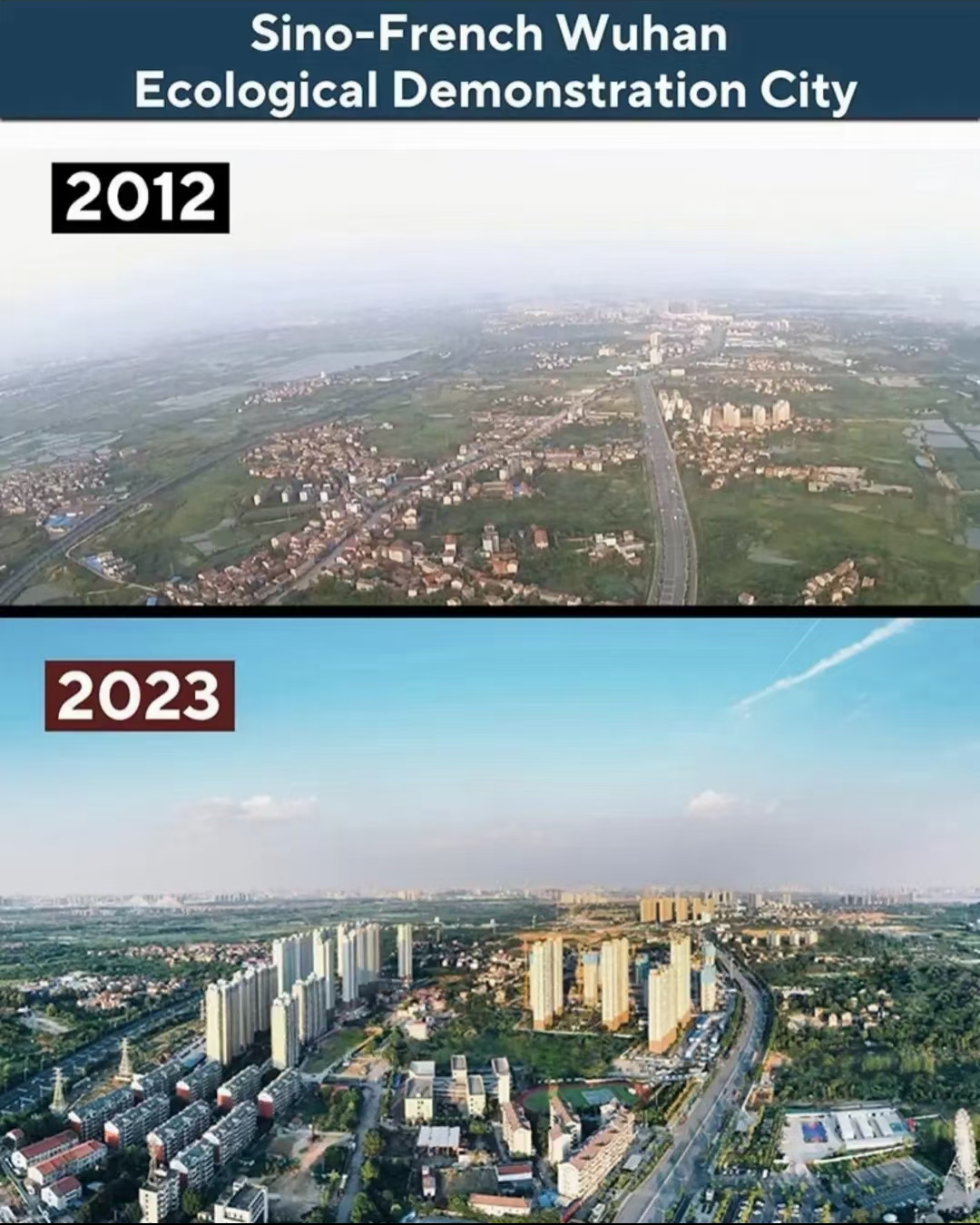在社交媒体脸书上发文盛赞中法武汉生态示范城十年的发展成就并放上今昔对比照展示从“城市远郊”