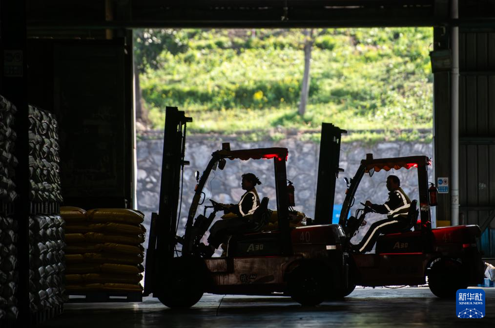 3月29日,在湖北宜化化工股份有限公司磷酸二铵成品仓库,工作人员驾驶叉车运输成品磷酸二铵。