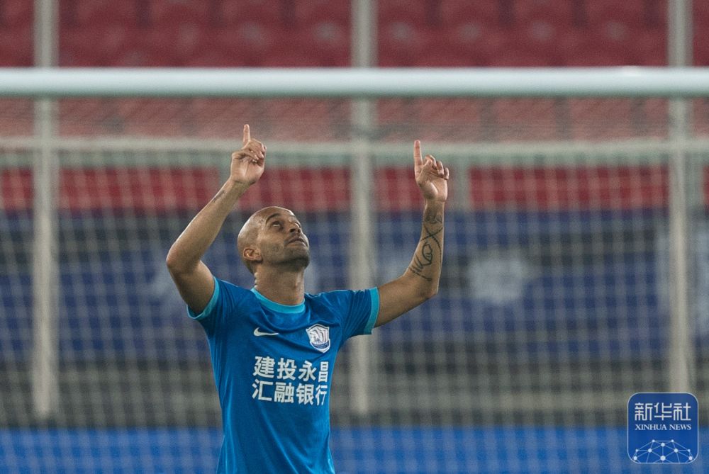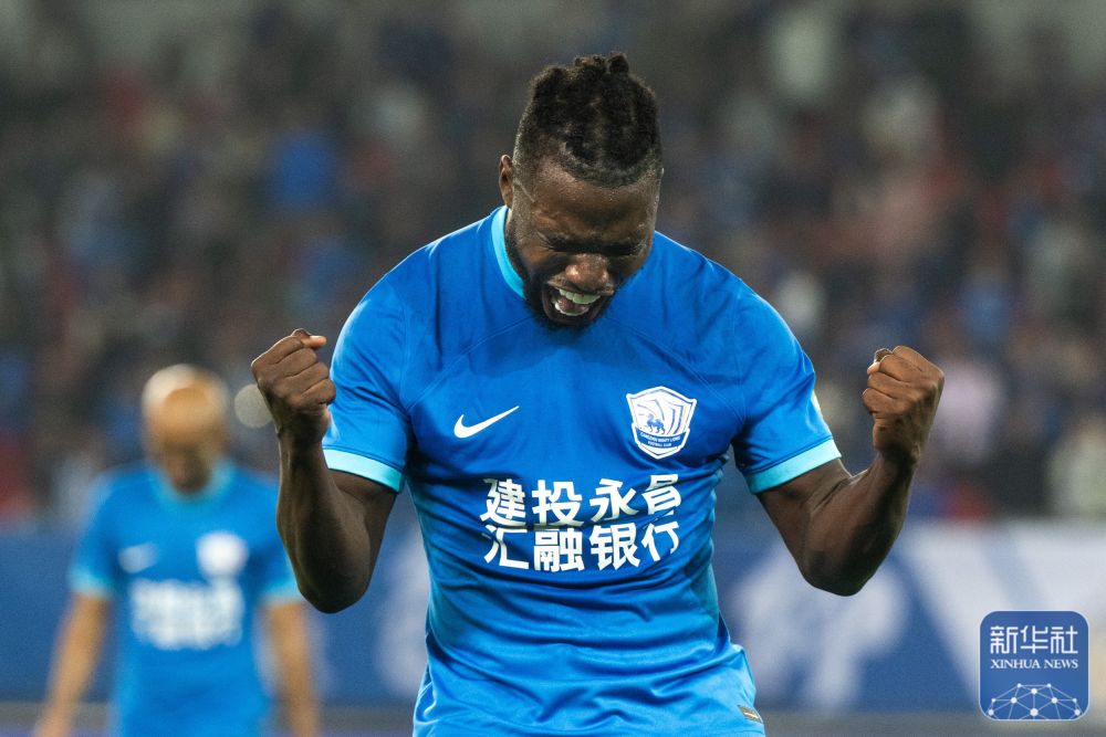 ↑沧州雄狮队球员埃韦尔进球后庆祝。