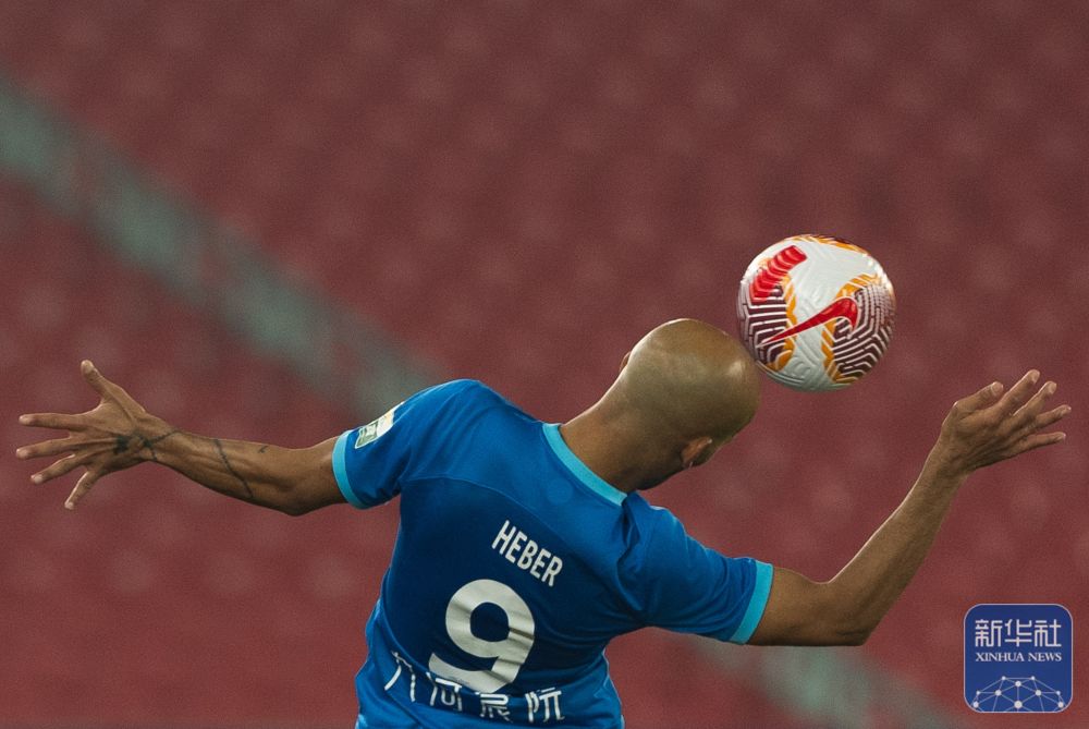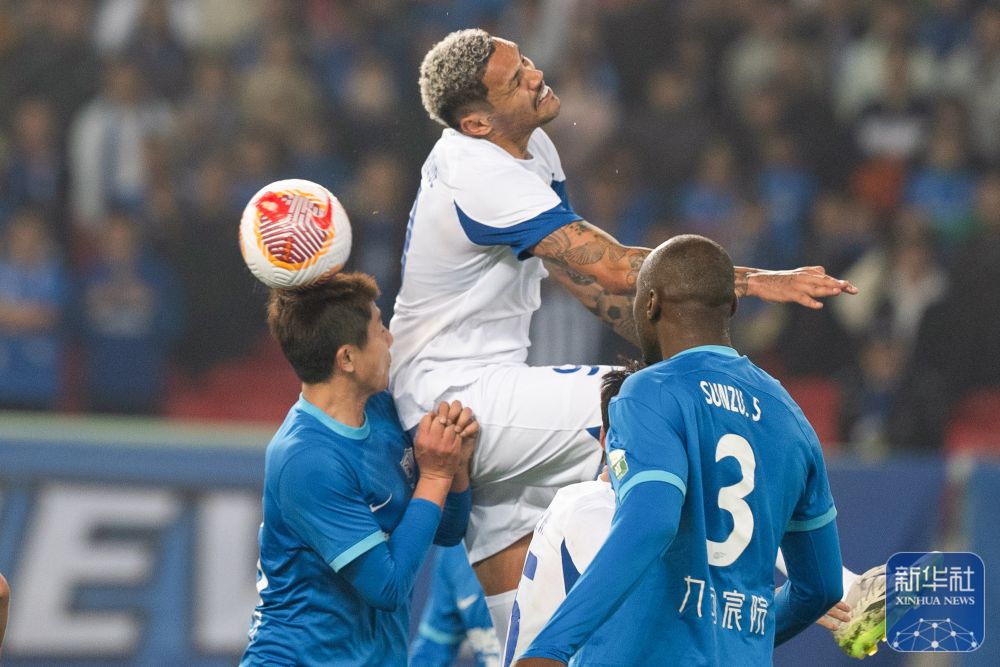 ↑武汉三镇队球员恩里克(中)在比赛中争顶。