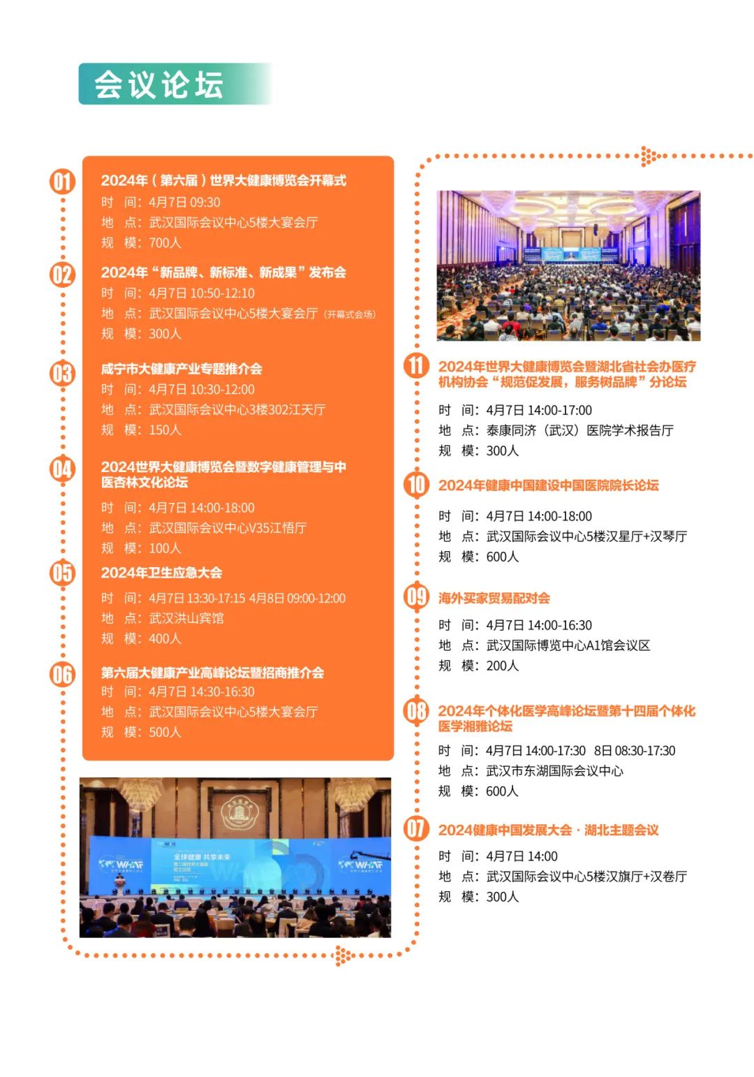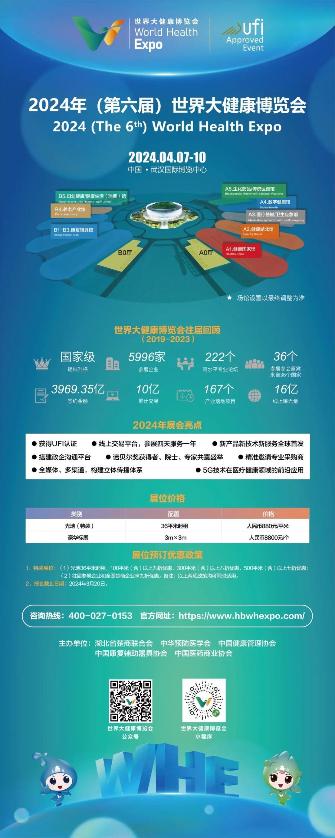 2024年(第六届)世界大健康博览会4月7日至4月10日在武汉举办。本届健博会以“健康共同体 科技创未来”为主题,继续致力于搭建全球大健康领域成果展示和交流平台,推进大健康领域产业和区域间合作。