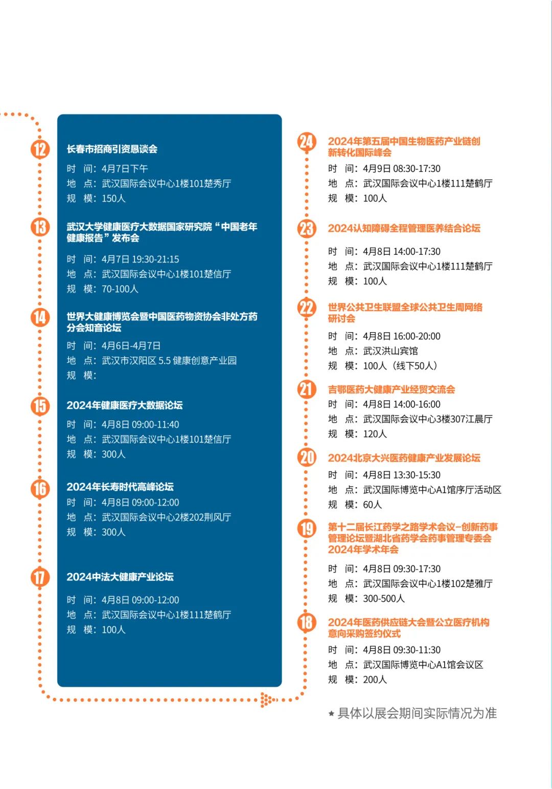 健博会同期举办第42届中国国际康复辅助器具产业暨国际福祉机器博览会,并举办大健康产业高峰论坛、2024年卫生应急大会、中法大健康产业论坛、个体化医学高峰论坛、医药供应链大会、长寿时代高峰论坛、海外买家贸易配对会等论坛会议活动,邀请大健康领域国内外院士专家、知名学者、知名企业家参会。