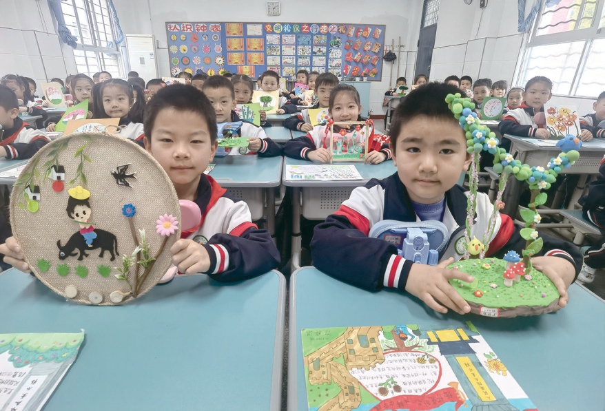 4月1日,市五堰小学学生展示自己动手制作的清明主题手工作品。通讯员李凯