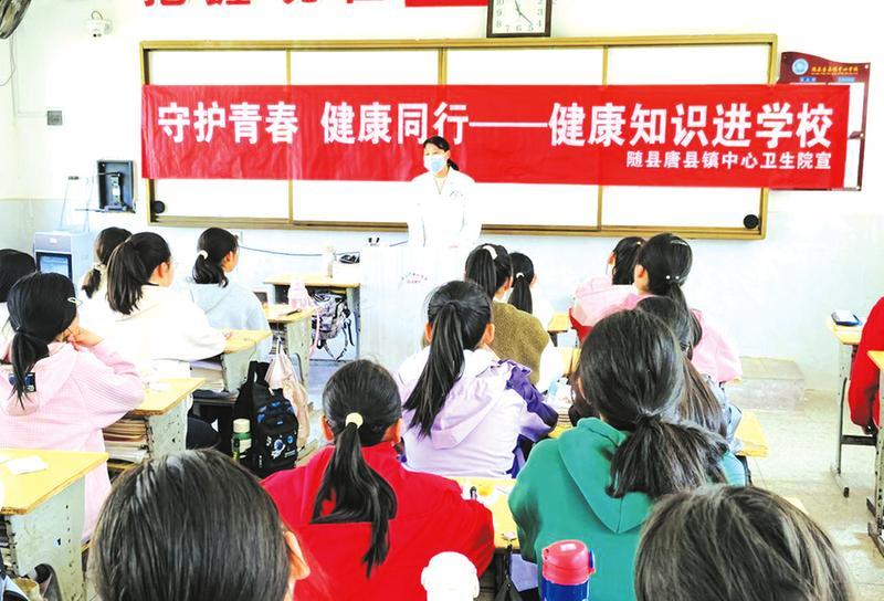 近日,随县唐县镇中心卫生院组织工作人员为在校适龄女生开展以“守护青春,健康同行”为主题的关于人乳头瘤病毒(HPV)疫苗知识宣传活动,为孩子们的健康成长护航。(随州日报通讯员周艳凤摄)