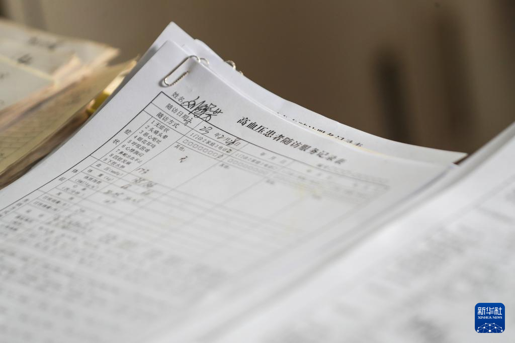 这是刘昌菊的高血压患者随访服务记录表(4月8日摄)。新华社记者 卢烨 摄