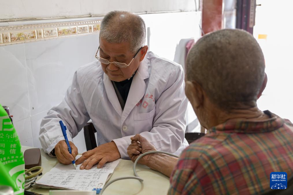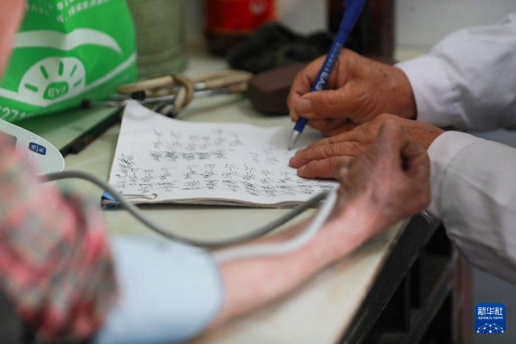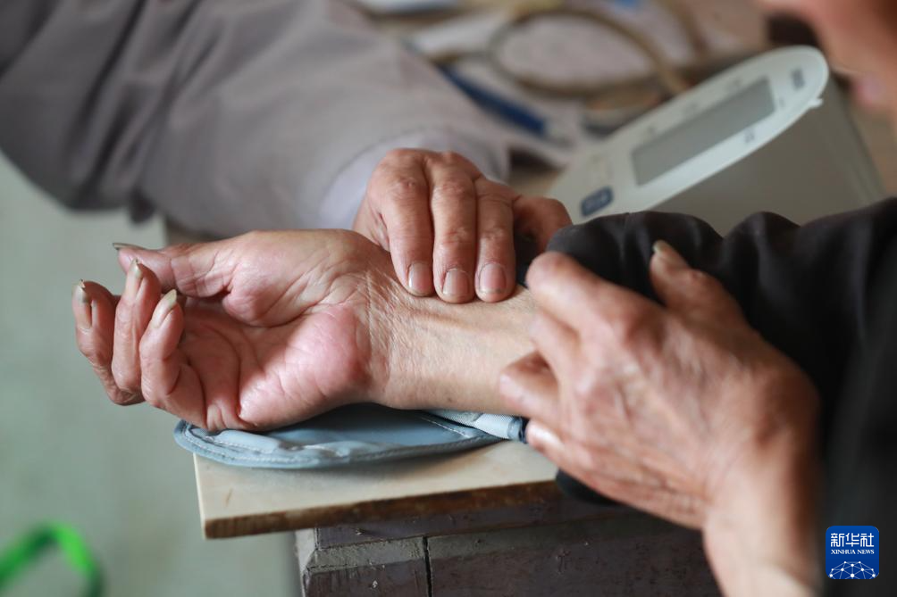 4月8日,在湖北省黄冈市红安县华家河镇大学村,刘昌菊在一户村民家中为村民把脉。新华社记者 卢烨 摄