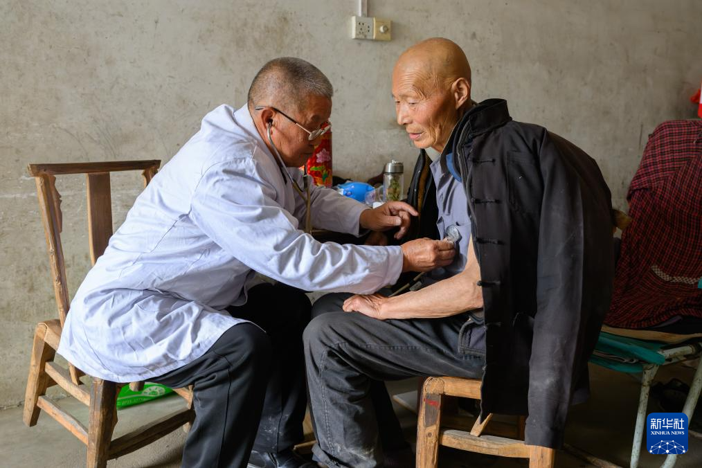 4月8日,在湖北省黄冈市红安县华家河镇大学村,刘昌菊在一户村民家中为村民听诊。新华社记者 胡竞文 摄