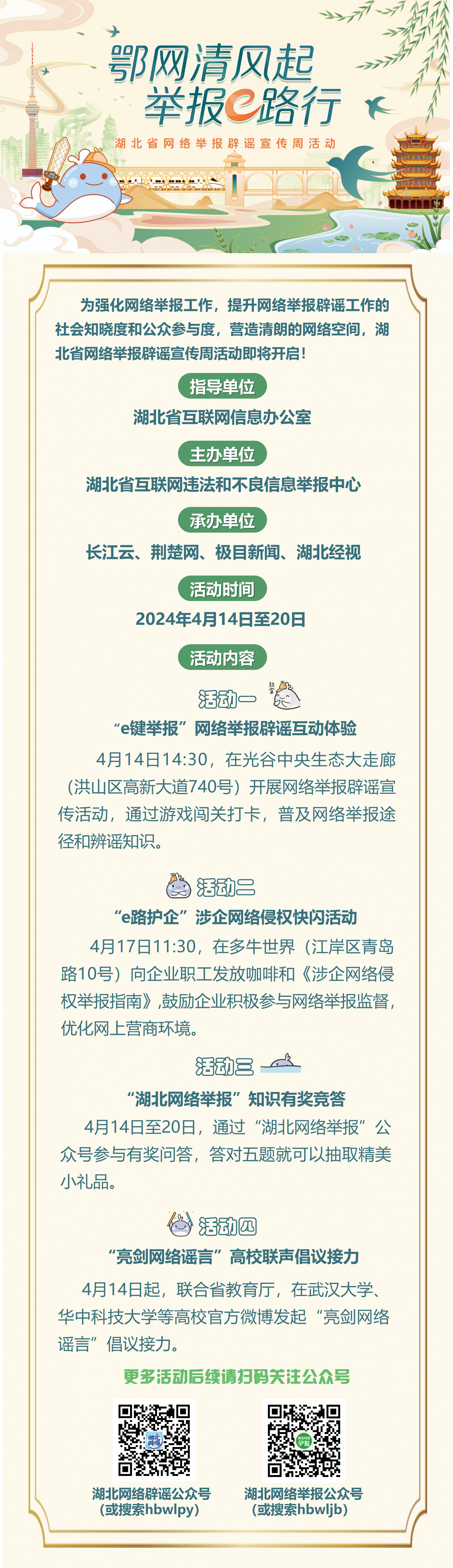 2024年4月14日至20日,湖北省互联网违法和不良信息举报中心将开展“鄂网清风起 举报e路行”湖北省网络举报辟谣宣传周活动。