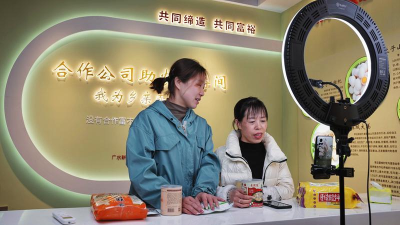 广水市李店镇飞跃村开通助农直播间,让家乡农特产品漫步“云端”,助力乡村振兴。图为近日该村“主播”在助农直播间售卖本村农产品。(随州日报全媒记者刘诗诗摄)
