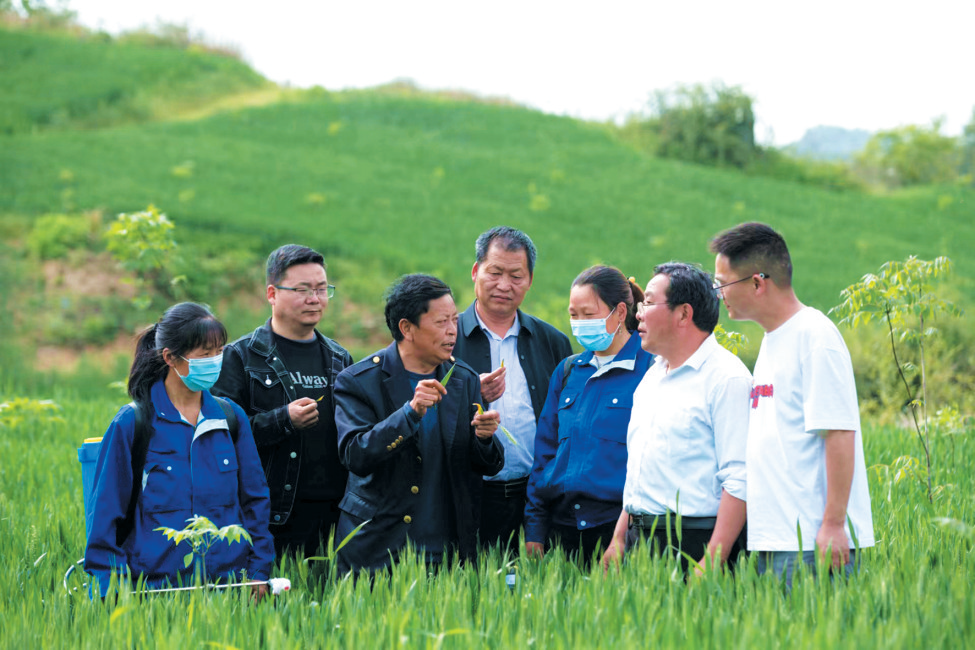 4月18日,竹山县植保站三名农业技术人员来到大庙乡鲁家坝村向粮食种植大户陈孝勤传授麦田管理技能。针对春季小麦容易患锈病和赤霉病等问题,该县农业农村局抽调工作人员组成10多个“田保姆”工作队,分赴溢水、宝丰、擂鼓、大庙等乡镇开展“虫口夺粮”保丰收行动,重点加强小麦“一喷三防”和油菜“一促四防”专业化统防统治力度,防治面积达1万余亩。特约记者陈昌荣通讯员叶当阳宋兴明摄