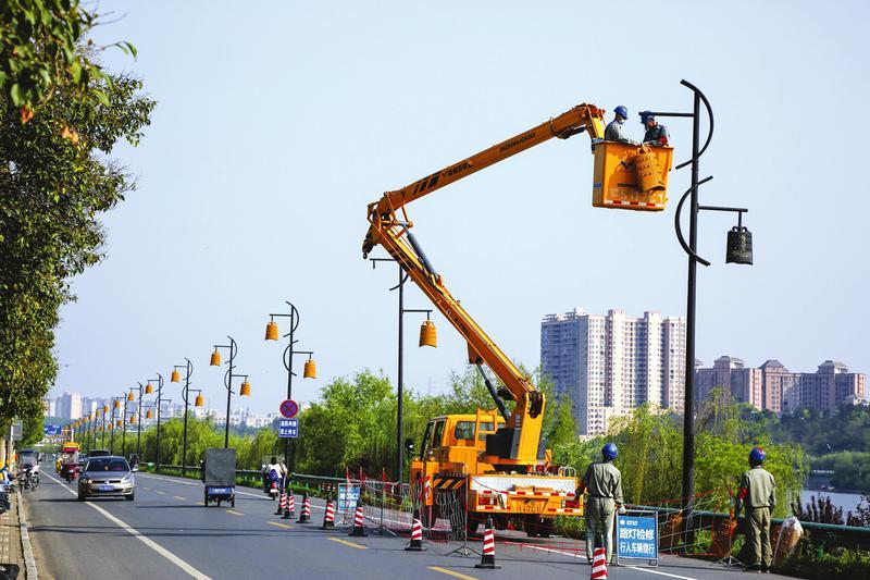 连日来,市路灯管理处利用晴好天气,对随州城区神农大道中段的115杆共计230盏路灯进行提档升级,保留编钟文化元素,更换新型节能灯具,增加弧形亮化灯带,进一步提升城市道路照明效果,以靓丽形象迎接寻根节。 (随州日报通讯员聂少峰摄)
