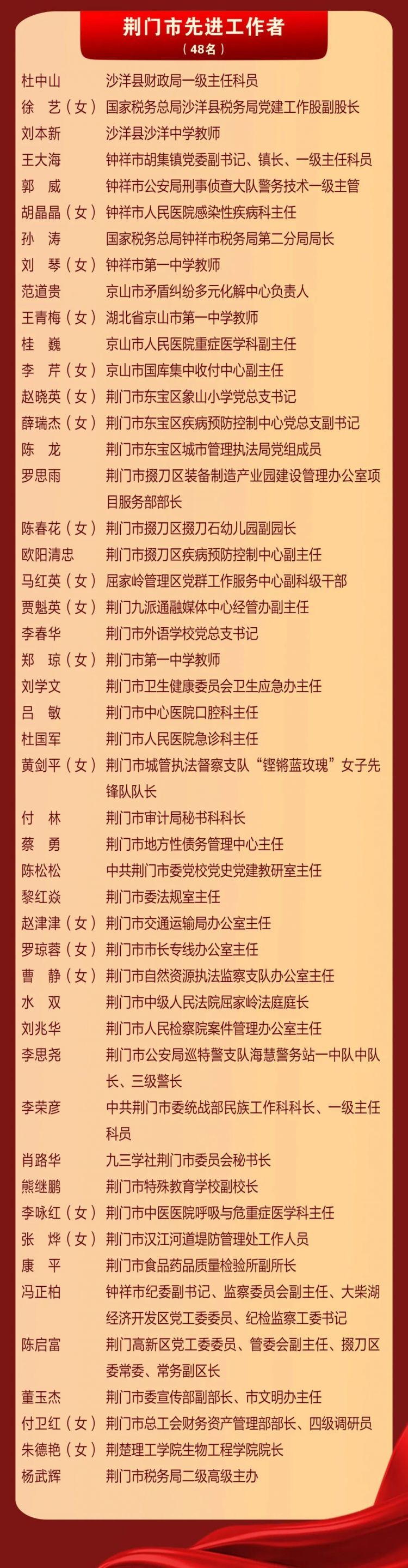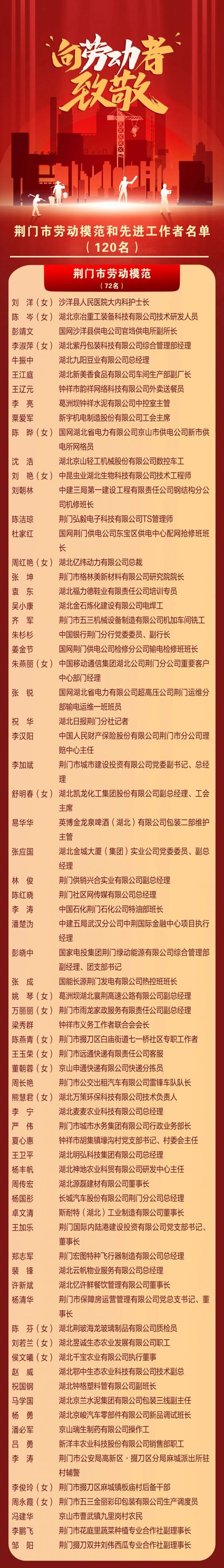 日前,荆门市委、市政府决定授予刘洋等72名同志荆门市劳动模范称号、杜中山等48名同志荆门市先进工作者称号。