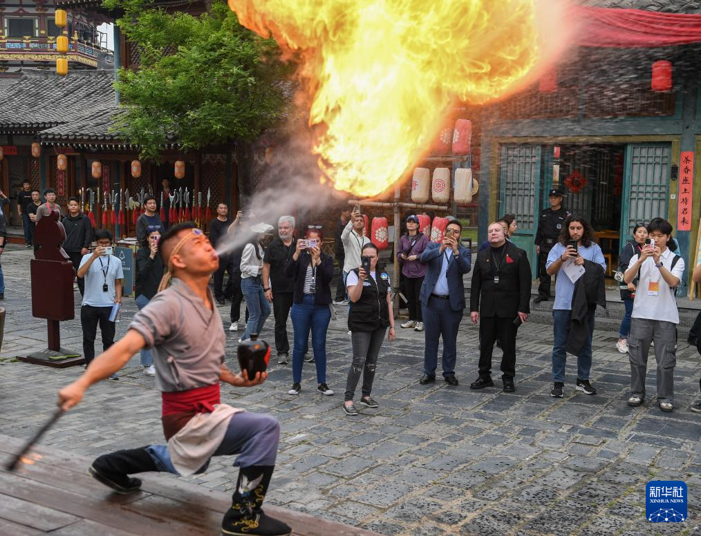 拉美和加勒比国家驻华使节、机构代表和记者在湖北省襄阳市唐城观看表演(4月22日摄)。