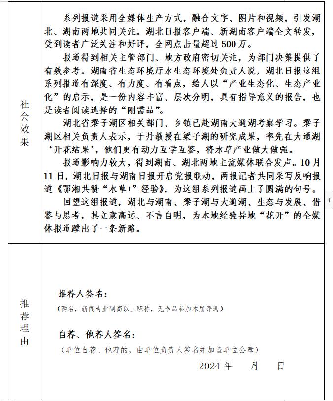 《湖北日报》2023年10月8日至10月10日刊发的系列报道《“梁子湖模式”花开湖南大通湖引出的话题》,拟参加湖南大学新闻与传播学院报送参评第三十四届中国新闻奖作品初评,现予以公示。公示期为2024年4月29日至2024年5月8日,如有异议,可以通过电话、传真或电子邮件等方式,于5月8日17时前反映,逾期不再受理。