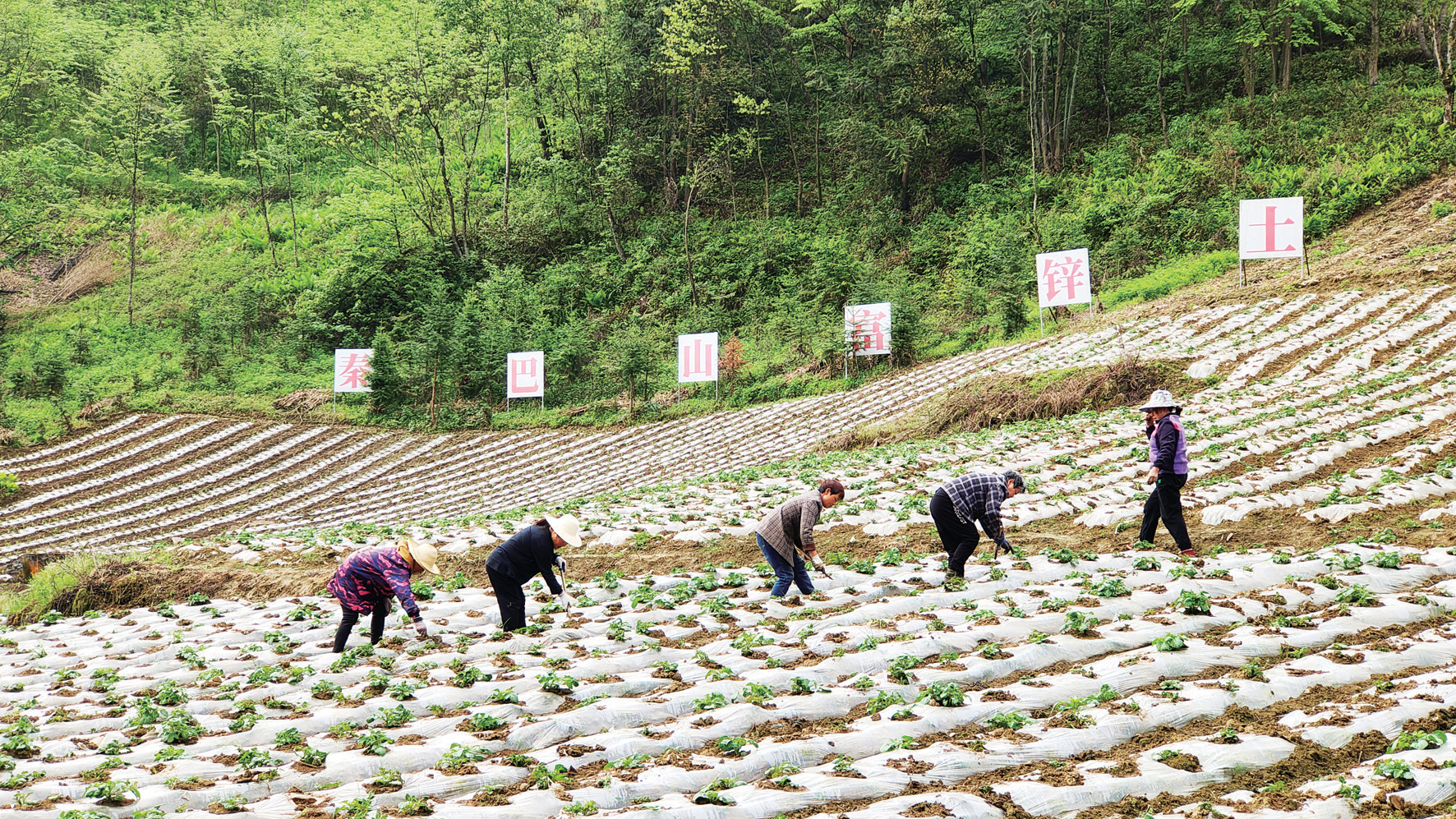 4月22日,在竹溪县泉溪镇塘坪村秦巴山高山富锌土豆良种繁育基地,村民们在扶苗培土,进行田间管理。该镇根据高山气候和土壤特点,依托华中农业大学的种源和技术,种植营养价值和经济价值较高的富硒土豆,高标准精细化打造秦巴山高山富锌土豆良种繁育基地。去年,该镇土豆种植面积达3万亩,把小土豆做成了大产业。特约记者郭军摄