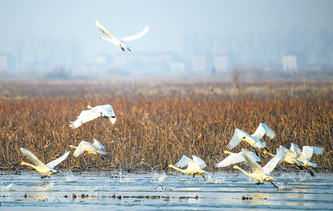 曾经,汈汊湖被分割成一块块小水田,我们无处栖息;现在,在汈汊湖湿地深处,白鹤、白琵鹭、大雁等飞鸟已经在这里安家了。人类拆除了湖内围堤100余万米,湖面“长大”20倍。