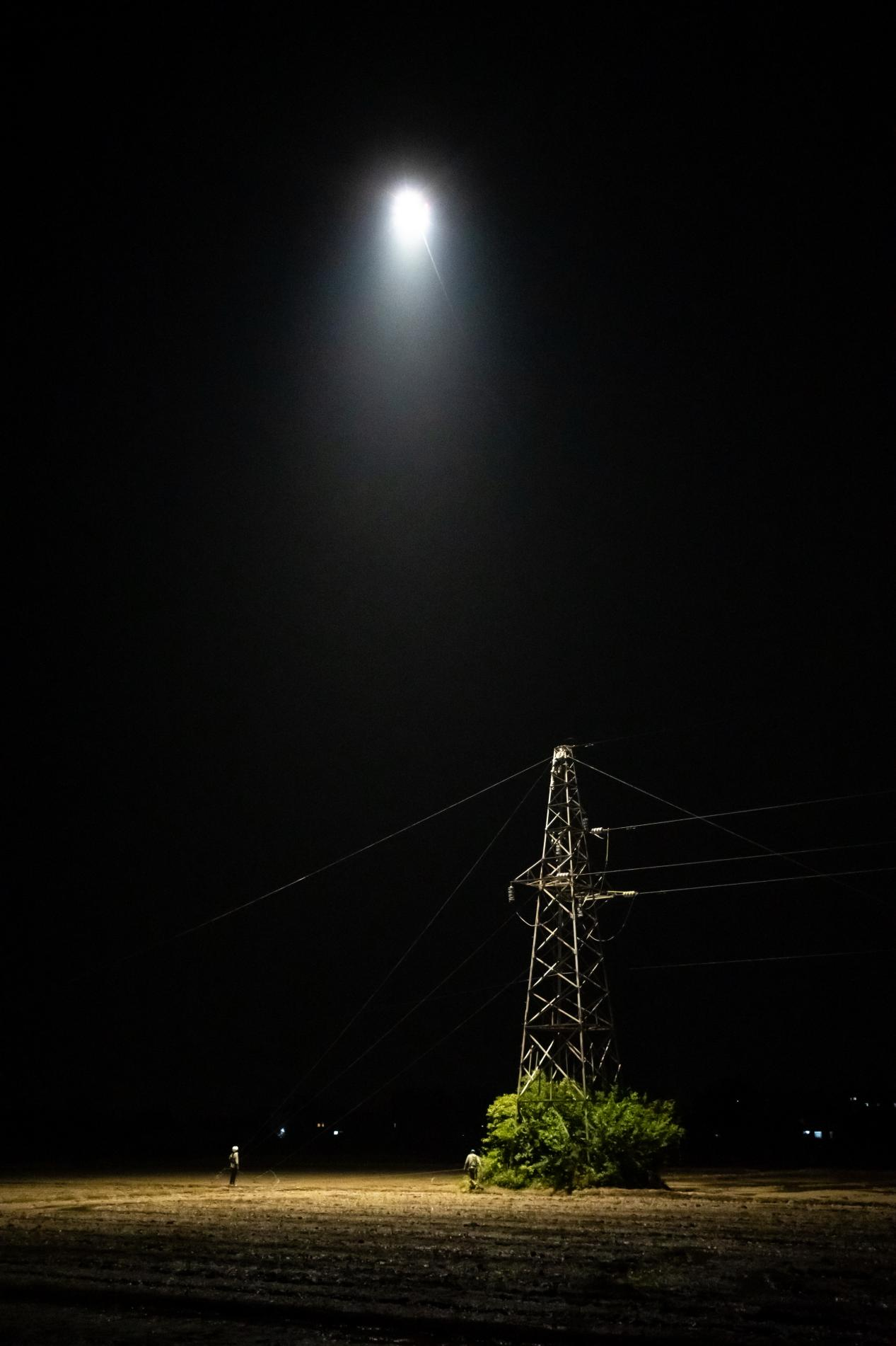 4月27日晚,在荆州观音垱小学附近的35千伏坮观线技改施工现场,“鄂电红马甲”正在操作一系留照明无人机,随着无人机高度的上升,点亮的面积不断扩大,照亮了整个坮观线施工现场,成为夜空中一颗“最亮的星”。