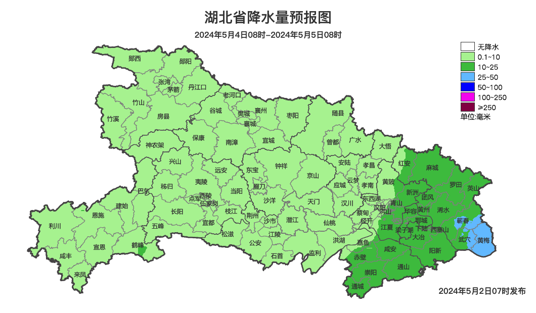 2日08时-3日08时,全省多云到阴天,鄂西北、鄂西南、江汉平原、鄂东南有阵雨或雷阵雨,局地中雨。最高气温鄂西南16~19℃、其他地区19~23℃,最低气温13~16℃,偏东风2到3级。