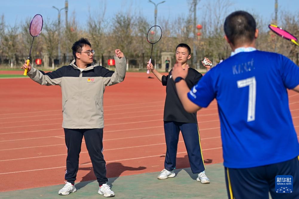 在新疆双河市高级中学,研究生支教团成员闫睿篪(左)给同学们上羽毛球选修课(4月11日摄)。新华社记者 丁磊 摄