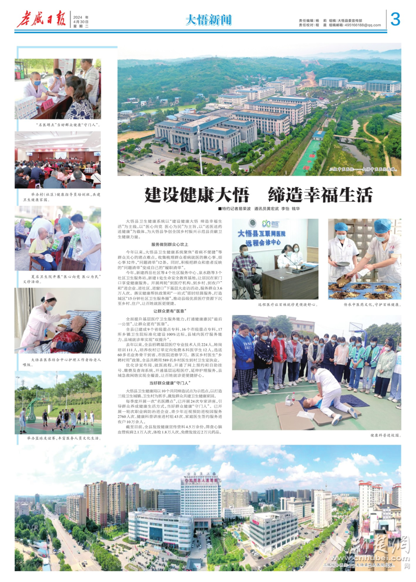 去年以来,大悟县招聘基层医疗专业技术人员224人,转岗培训111人,培养农村订单定向免费本科医学生12人,选送60多名业务骨干到省、市医院进修学习。落实乡村医生“乡聘村用”政策,大悟县共聘用589名乡村医生到村卫生室执业。优化诊室布局、就医流程,大悟县开通了网上预约和自助挂号、缴费及查询系统,开通基层远程医疗,延伸护理服务,县域急救网络实现全覆盖,让百姓就诊更便捷舒心。