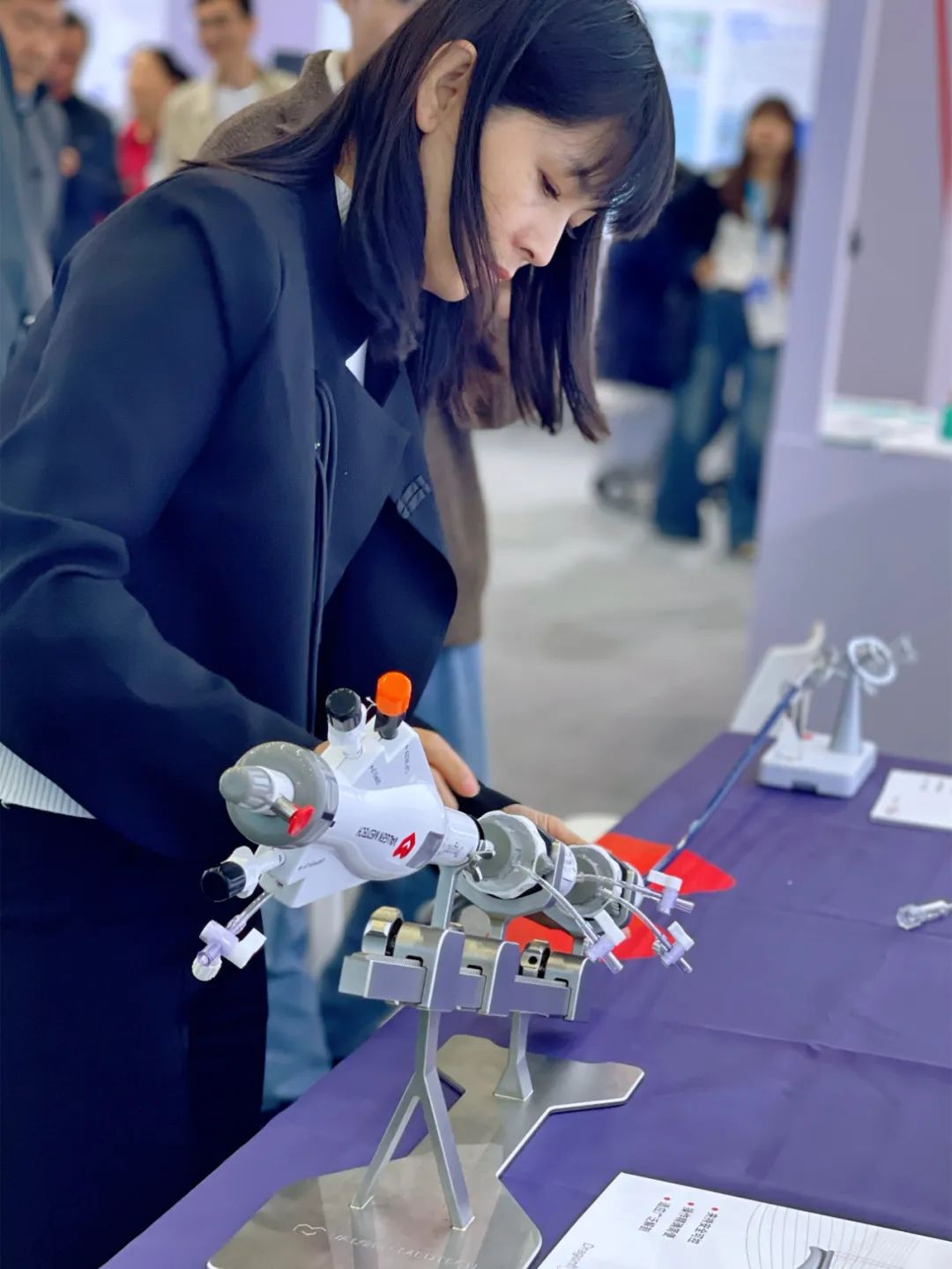 健博会现场,工作人员演示二尖瓣钳夹的夹闭过程。