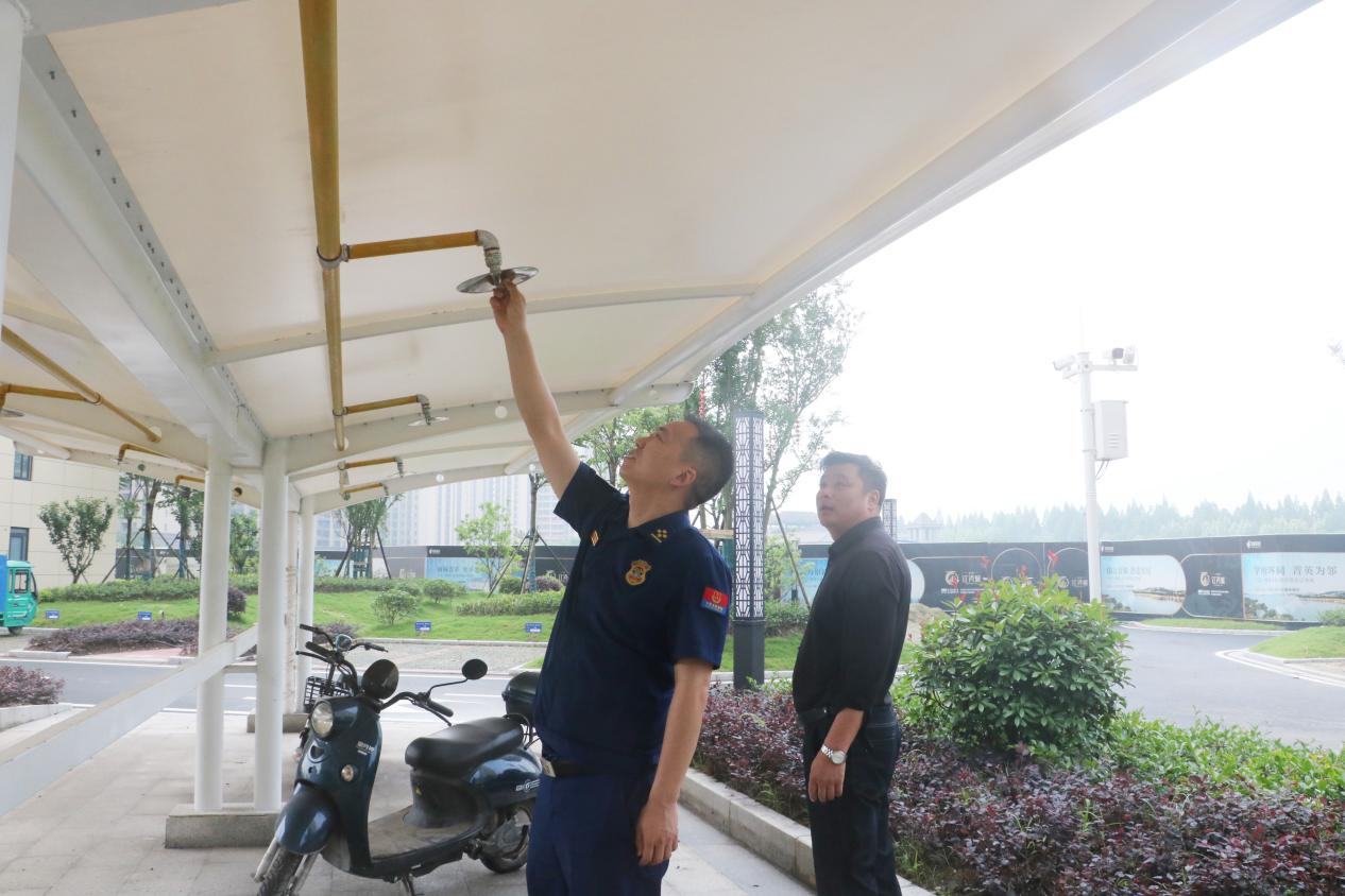 消防监督员查看电动车停放场所的喷淋设施 摄影:陈园