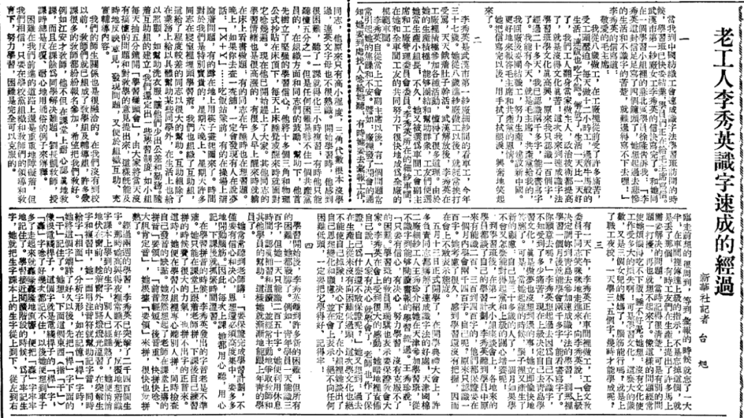 5月,长江日报记者广泛搜集并翻阅查找旧报刊、历史资料,在《人民日报》1952年7月6日3版上找到了一篇珍贵的报道。报道详细讲述了武汉市第一纱厂细纱间的看车工李秀英识字的故事。