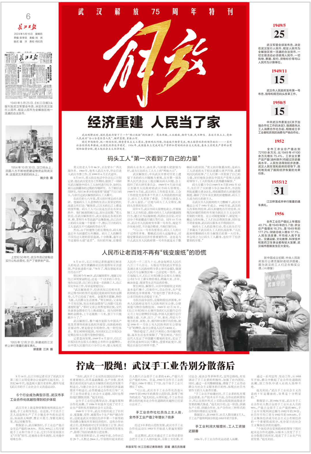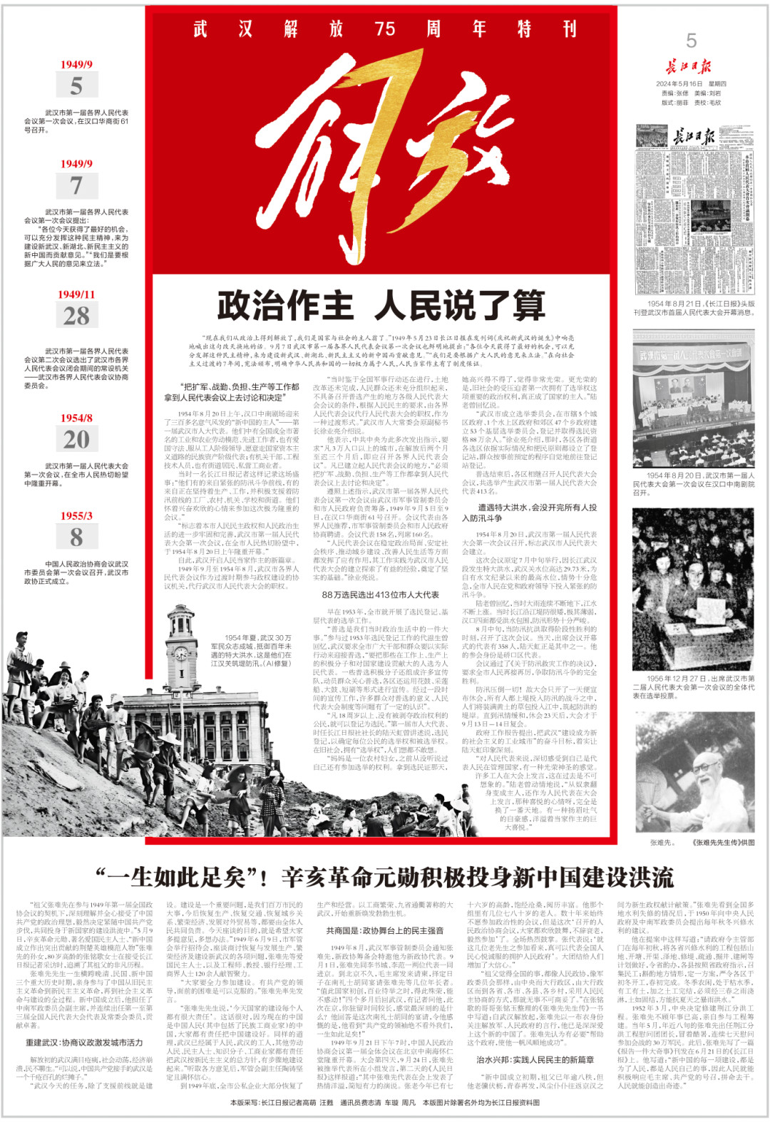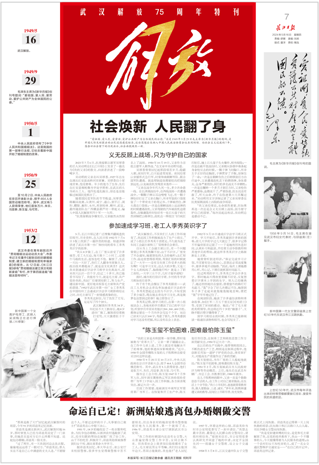 “现在我们从政治上得到解放了,我们是国家与社会的主人翁了。”1949年5月23日长江日报在发刊词《庆祝新武汉的诞生》中响亮地喊出这句改天换地的话。
